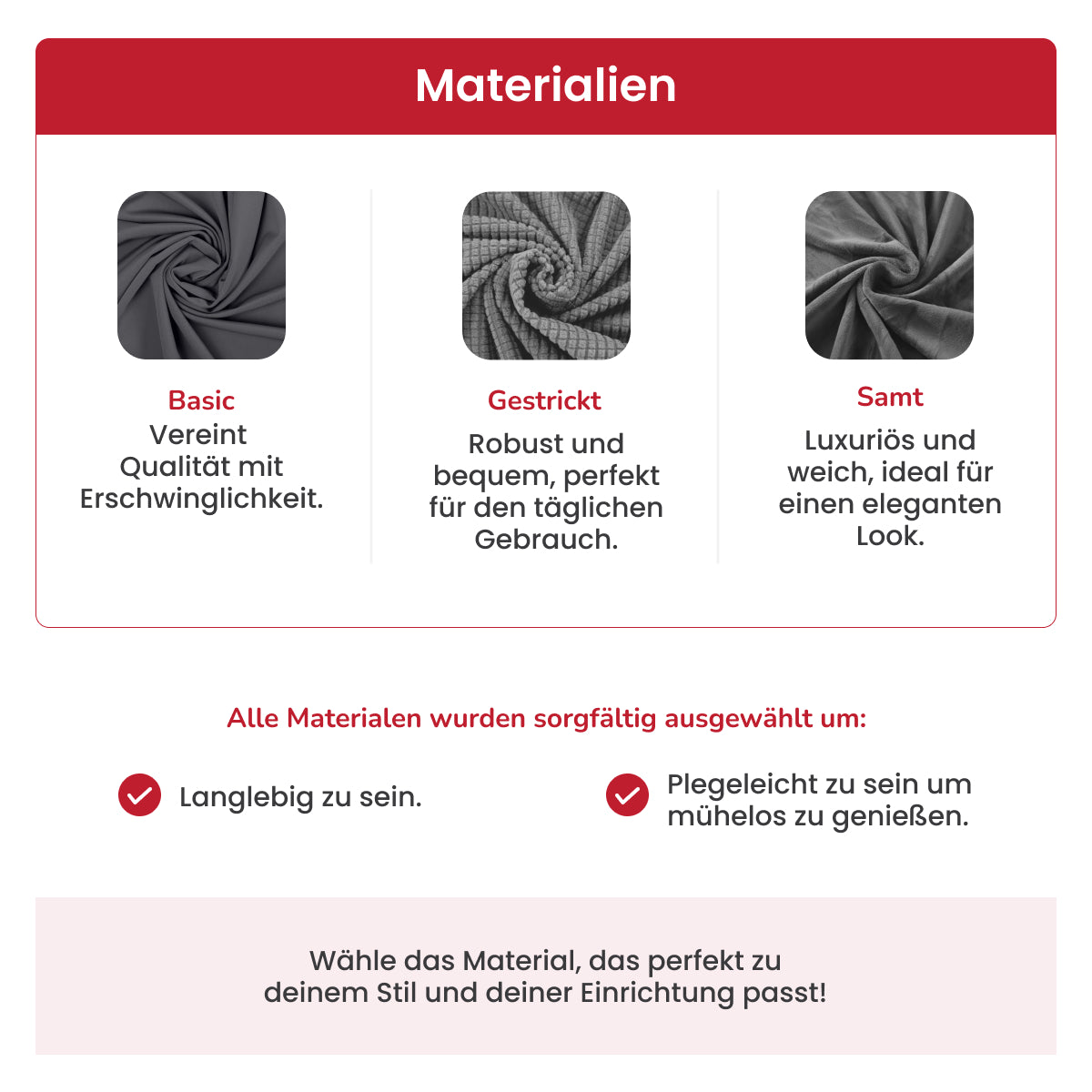 Jedes Material wurde sorgfältig ausgewählt, um Langlebigkeit und einfache Pflege zu gewährleisten. Wähle das Material, das am besten zu deinem Lebensstil und deiner Einrichtung passt!